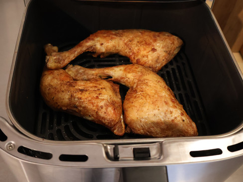 Hähnchenschenkel: 30 Minuten bei 200°C. Außen knusprig, innen saftig – gleichmäßig gegart. Die Schüttelerinnerung hat mich einmal daran erinnert, den Korb zu schwenken. Einmal kurz geschüttelt, fertig. Kein ständiges Nachschauen, kein Raten ob es durch ist. Ehrlich gesagt meine Rettung an Tagen, an denen ich keine Zeit und keine Energie für aufwendiges Kochen habe.